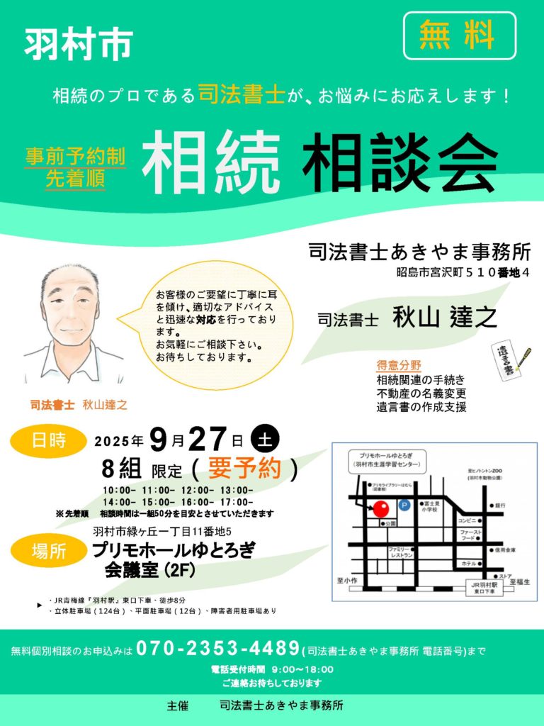 プリモホールゆとろぎ(羽村市生涯学習センター)で相続相談会を行いました。今回は2組様💦でした。ただ、いずれも深い内容のご相談で充実感はありましたよ。2週間後にもう一度近隣で相談会やります。お近くの方はぜひ✨