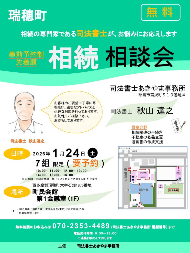 瑞穂町町民会館で相続相談会を行いました。今回のご来場は2組様でしたが、別途「都合が合わず伺えないが、相談させて欲しい」とのお話を頂いて個別対応しました。フットワーク軽めでやってますので、その辺りはお気軽に✨