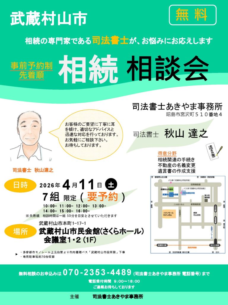 武蔵村山市民会館で相続相談会を行いました。今回は3組様のご参加でした(ドタキャン1件あり💦)。他に、調整のつかなかった方へは別日で訪問対応して来ました。喜んで頂けてなによりでした😄